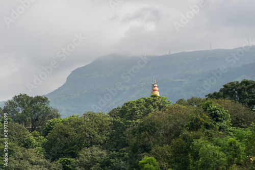 Spire of a temple rising above dense trees in Tapola village of Satara district, Maharashtra, India