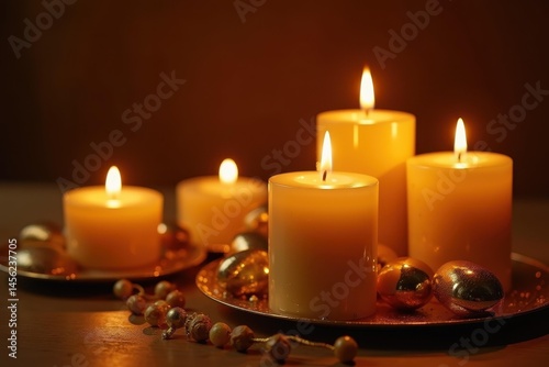 Spiritual Inner Peace. Yellow burning candles on plates with beads and