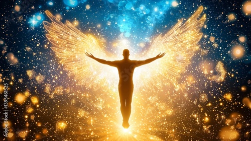 Spiritual soul vibration. A luminous figure with golden wings stands in a cosmic setting, radiating energy and light, symbolizing transcendence and spirituality.