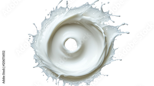 Splash of milk creating a circular shape with white droplets around it. transparent background