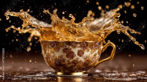 Splashing liquid overflows from a beautiful vintage teacup adorned with delicate floral patterns against a dark, high contrast background.