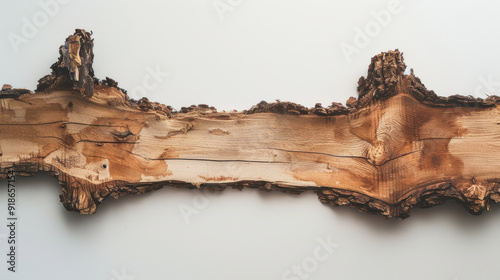 Splintered wooden plank with a rough texture cut out on a pristine white backdrop.