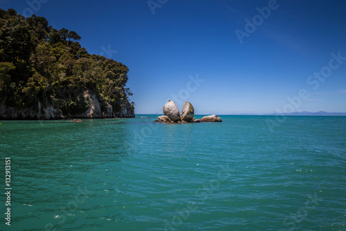 Split Apple rock landmark in landscape with blue ocean and clear sky, Abel Tasman New Zealand