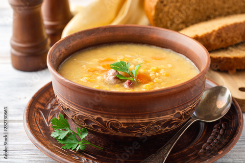 Split pea soup in ceramic bowl on wooden table. Selective focus.