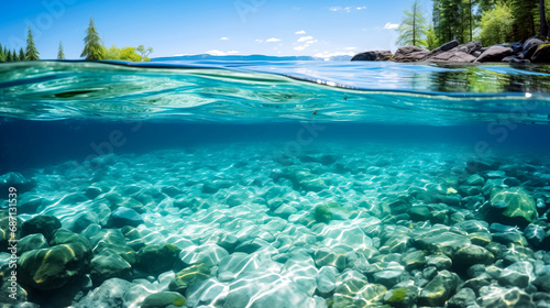 Split underwater photo of beautiful seascape with water surface and coral reef. Tropical landscape. Rocks and blue water. Summer time.
