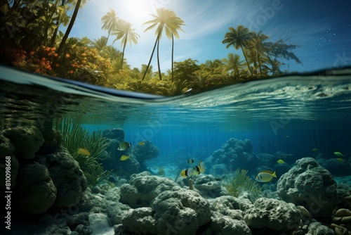 Split-level shot of a vibrant coral reef and lush island above water in a serene tropical setting