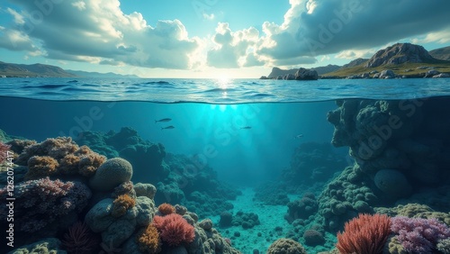 Split-view of a bleached coral reef with clear ocean water and sunlight rays