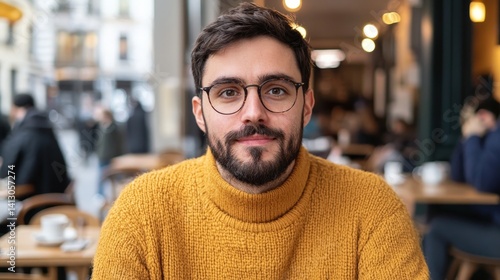 spontaneity moments concept. Young man with glasses in a cozy café setting.