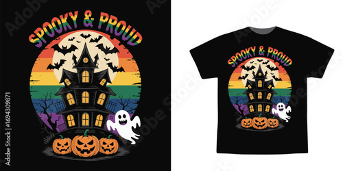 Spooky and Proud Halloween T-Shirt Design – Haunted House, Pumpkins, Ghost, and Rainbow Pride Background Vector Illustration