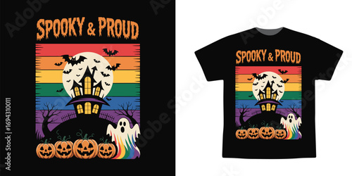Spooky and Proud Halloween T-Shirt Design – Haunted House, Pumpkins, Ghost, and Rainbow Pride Background Vector Illustration