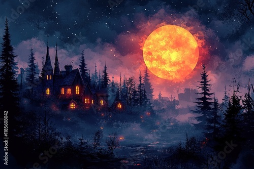 Spooky castle at night with full moon over forest. Use Horror illustration