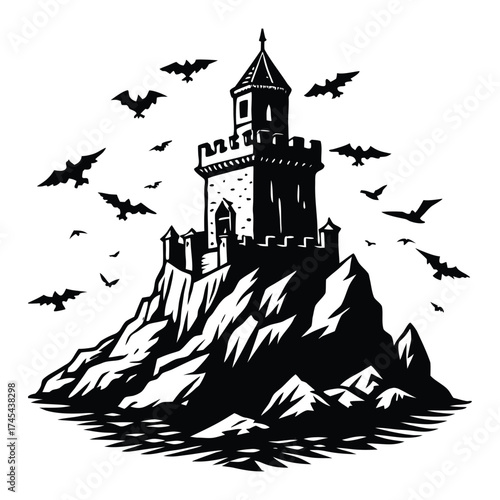 Spooky Castle Silhouette on a Cliff with Bats, Halloween Graphic on White Background