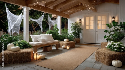 Spooky decorations adorn a front porch featuring hay bales, black and white pumpkins, and cobwebs, creating a magical Halloween atmosphere