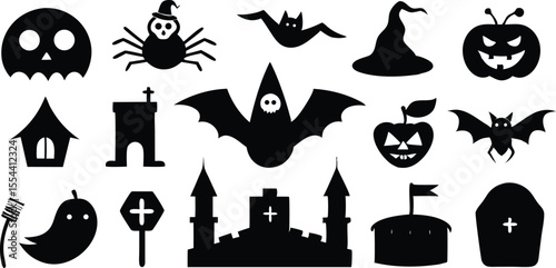 Spooky Halloween border of cute cartoon trick-or-treat silhouettes. Halloween icon set, Black and white halloween vector silhouette set