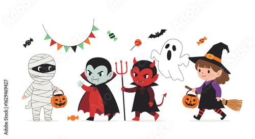 Spooky halloween characters collecting treats during a festive autumn celebration