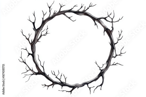 Spooky Halloween Circle: Horizontal Seamless Frame of Black Thorn Branches in Watercolor on White Background