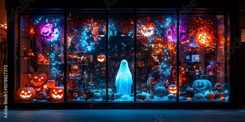 Spooky Halloween Display with Jack-o-Lanterns, Ghost, and Festive Lights - Photo