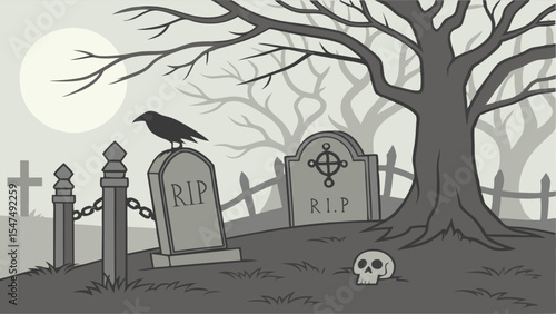 Spooky Halloween Graveyard with Tombstones, Bare Trees, Full Moon, Crow, and Skull. Dark Cemetery Scene at Night.