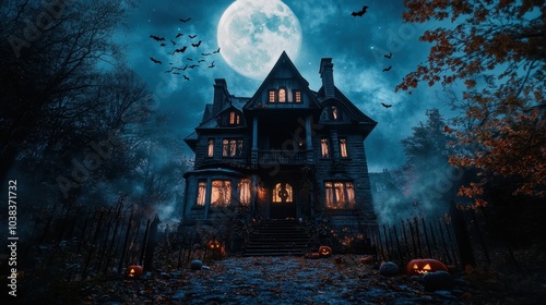 Spooky Halloween Haunted House with Full Moon, Bats and Jack-O-Lanterns