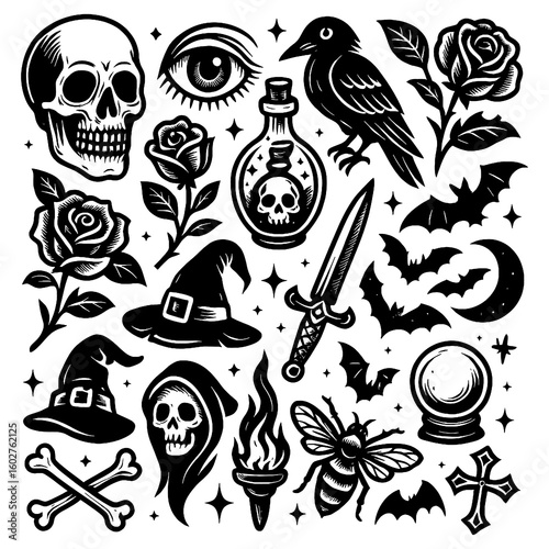 Spooky Halloween icons with skulls, ghost, and witch elements in bold black style, Transparent Background