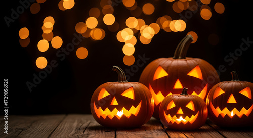Spooky Halloween jack-o'-lanterns with glowing faces and bokeh lights on a wooden surface at night