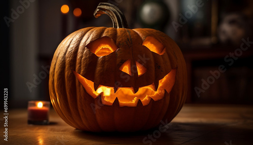 Spooky Halloween night, glowing pumpkin lantern, evil smiling ghost decoration generated by AI