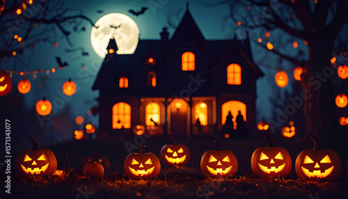 Spooky Halloween Night: Pumpkins Glowing in the Moonlight, haunted house