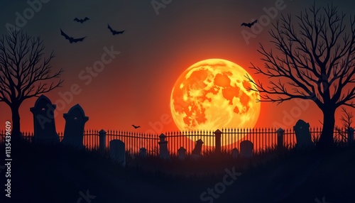 Spooky Halloween night scene displays cemetery with dark silhouette trees, gravestones under large orange moon. Silhouette bats fly across orange sky. Dark, eerie atmosphere suggests Halloween