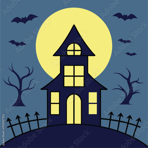 Spooky halloween night scene featuring a haunted house bats moon and silhouetted trees