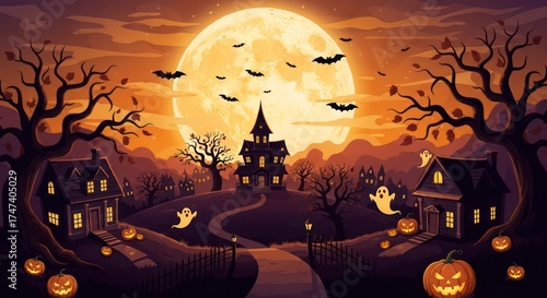 Spooky Halloween Night with Haunted House, Full Moon, Bats, and Ghosts.