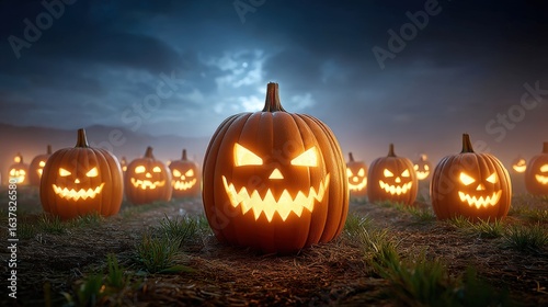 Spooky Halloween Pumpkin Field with Menacing Faces and Dark Sky