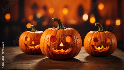 Spooky halloween pumpkins on bright orange background with ample space for creative text placement.