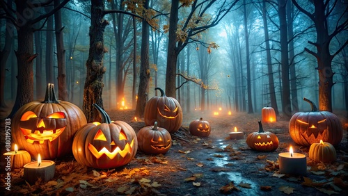 Spooky Halloween scene in a dark forest with glowing jack-o'-lanterns and mist for a haunting holiday atmosphere, Halloween