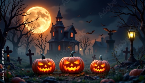 Spooky Halloween Scene with Pumpkins Haunted House and Fog