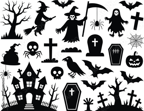 Spooky Halloween Silhouette Set: An eerie assortment of classic Halloween symbols, including ghosts, pumpkins, bats, and witches, arranged in striking monochrome silhouettes.