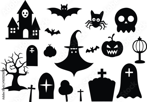 Spooky Halloween Silhouettes: Haunted House, Bats, Ghosts, Pumpkins, Skulls, and More