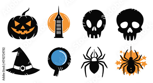 Spooky Halloween symbols and festive designs featuring pumpkins, skulls, spiders, and witch hats