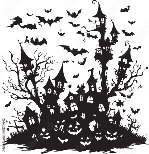 Spooky Halloween vector illustration set with pumpkins, bats, ghosts, and a haunted castle background under an autumn moonlit night
