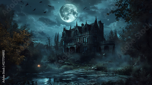 Spooky house under a full moon. Dark Fantasy Moonlit Castle. Illustration