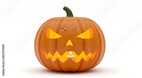 Spooky Jack O Lantern with a Flickering Candle Inside Glowing with an Eerie Orange Light on a White Background