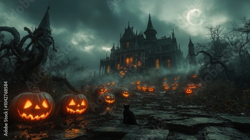 Spooky old haunted house: Eerie house surrounded by mysterious fog at night. Halloween, horror, fairytale background concept.