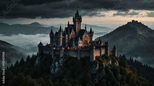 Spooky old medieval castle: Ancient eerie castle. Halloween, horror, fairytale background concept.