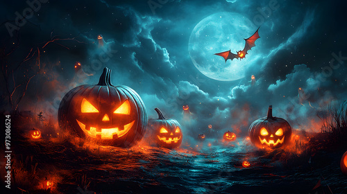 Spooky scene with glowing jack o lanterns and flying ghosts, set against a moonlit sky with eerie shadows.