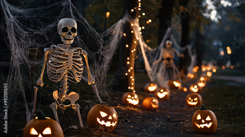 Spooky Skeletons and Pumpkins in Halloween Park