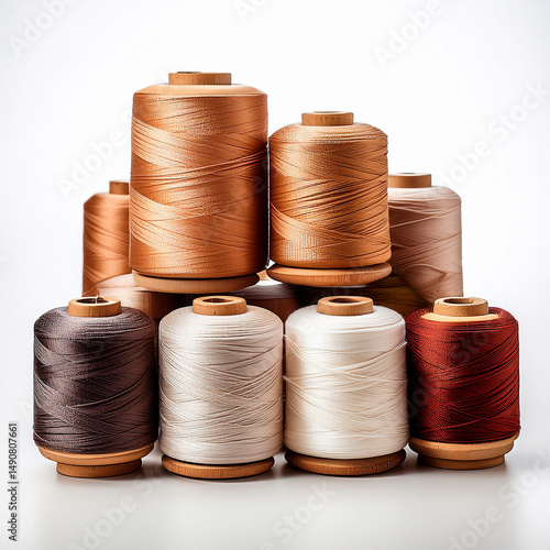 Spools of thread arranged in a stacked formation showcasing various warm tones and textures in a crafting setup