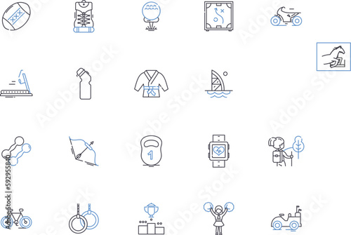Sport equipment outline icons collection. Racket, Shoes, Gloves, Balls, Uniform, Locker, Racquets vector and illustration concept set. Bat, Pads, Helmet linear signs
