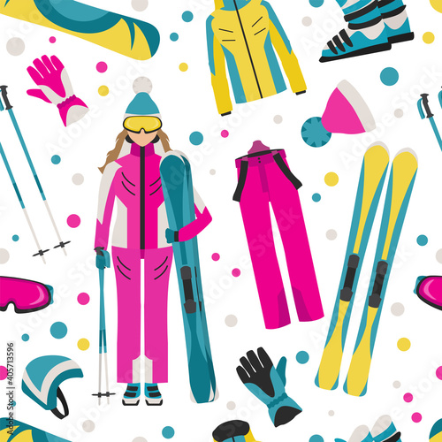 Sporting gear set. Ski equipment and skier woman seamless pattern