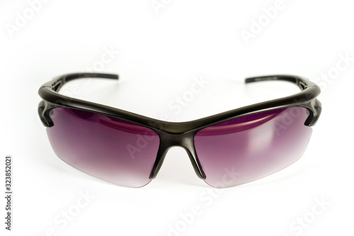Sports and safety glasses made of black plastic with dark glasses, shot on a white background. Background for cycling. Background for work safety.