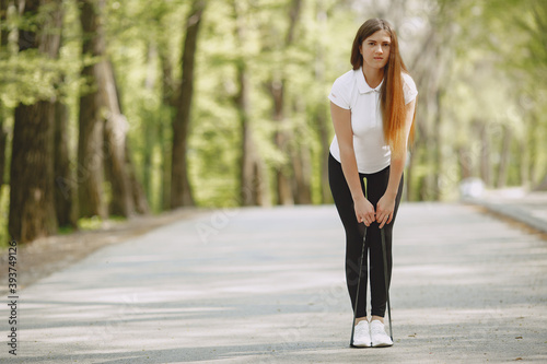 Sports girl. Woman in a summer forest. Lady in a sports wear.