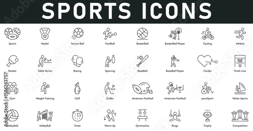 Sports Icons vector illustration with thin line editable stroke contain medal, football, basketball, cycling, athlete, racket, table tennis, sparing, cardio, gym, weight training, golf, volleyball